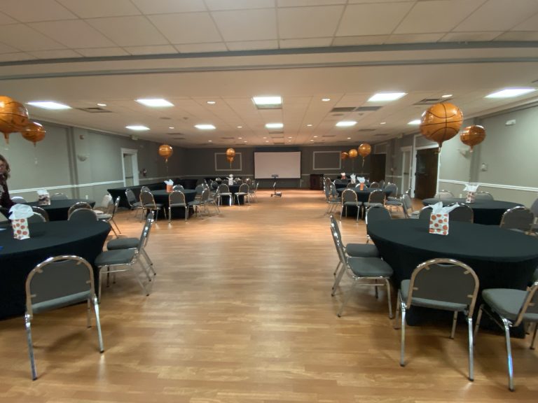 Our spacious hall holds 220 people. We offer 60” round tables which seat eight people with banquet-style padded chairs that are included with the rental fee. The facility is completely handicap accessible, with ample parking. A large capacity ice machine and free WIFI are included during your event.